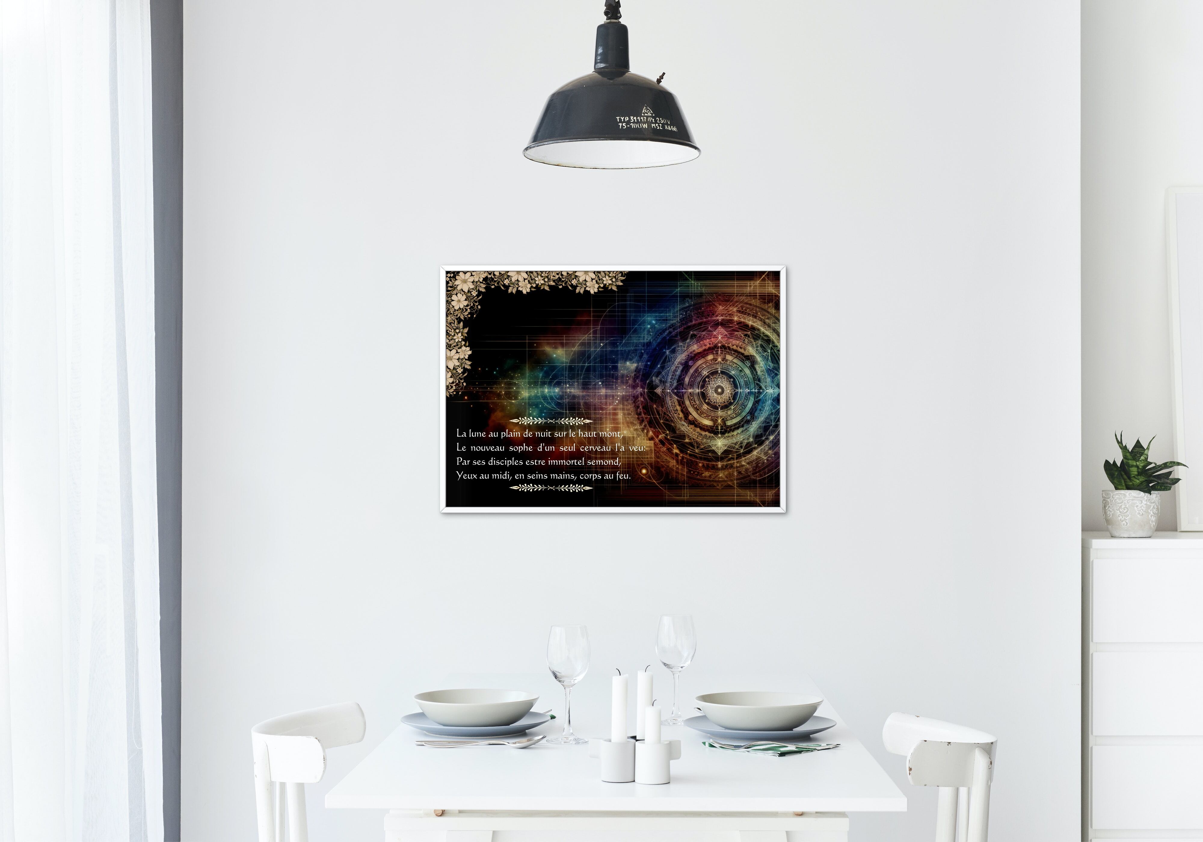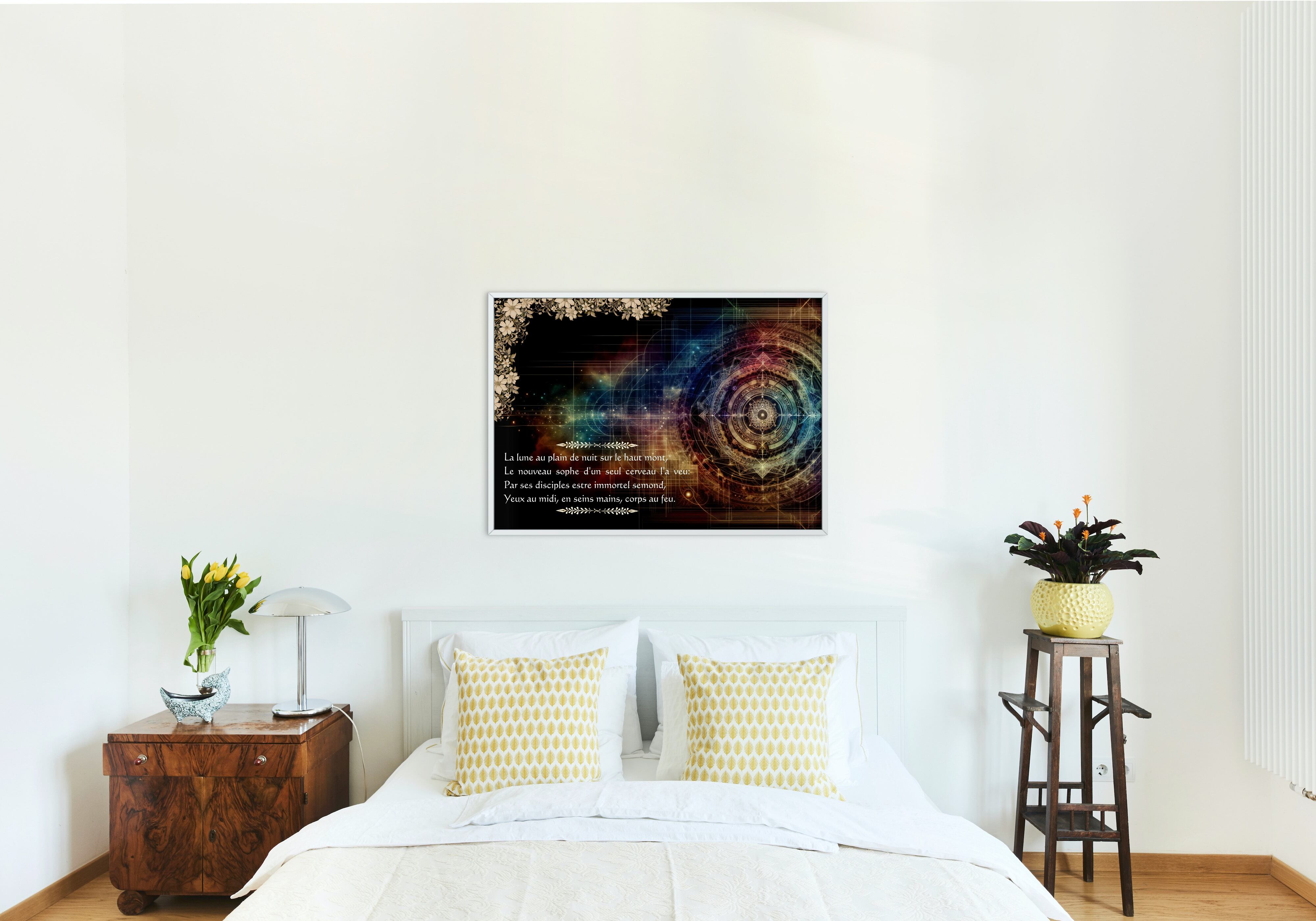ノストラダムスの神秘的な詩の一節をフィーチャーしたデジタルアートプリントです。